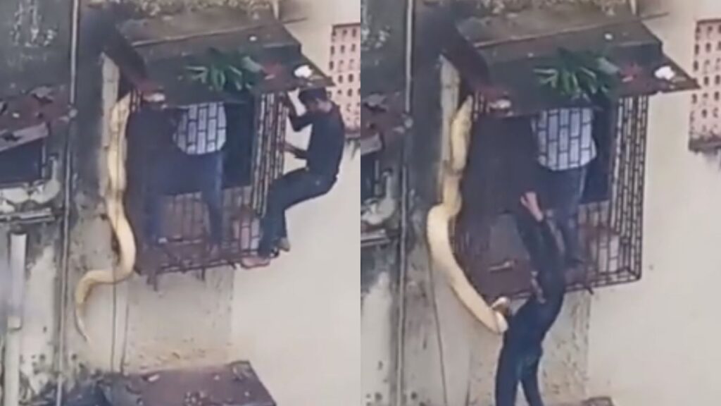 या सापाला रेस्क्यू करण्यासाठी दोन तरूणांनी पुढाकार घेतल्याचे व्हिडिओत दिसत आहे. एक तरूण हा घरातील किचनच्या बाल्कनीत उभा असून, सापाची सुटका करण्याचा प्रयत्न करतो आहे. तर दुसरा तरूण हा बाल्कनीच्या बाहेरून चढला आहे आणि सापाला सोडवण्याचा प्रयत्न करतोय. या दोन्ही तरूणांच्या शर्थीच्या प्रयत्नानंतर या सापाची बाल्कनीच्या ग्रीलमधून सुटका झाली आहे. या सुटकेनंतर साप थेट ग्रीलमधून खाली कोसळला आहे.