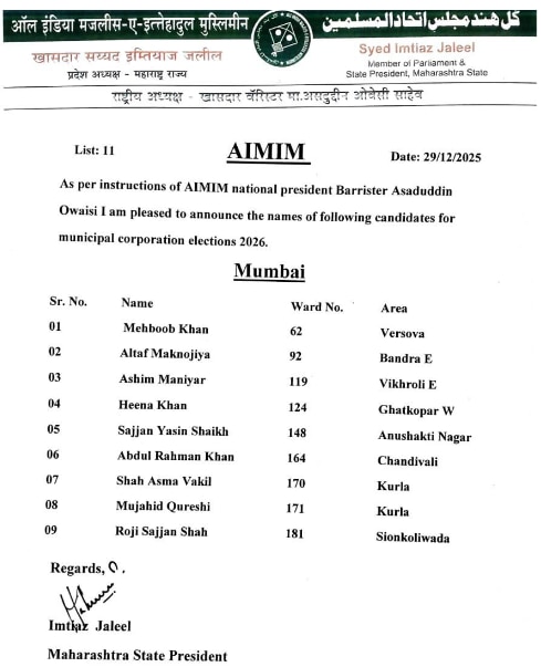 मुंबई महापालिका निवडणुकीसाठी एमआयएम पक्षाकडून उमेदवारांची पहिली यादी जाहीर
