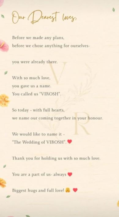 रश्मिका मंदाना आणि विजय देवरकोंडा यांनी संयुक्तपणे पत्राद्वारे लग्नाची पुष्टी केली. दोघांनीही त्यांच्या लग्न समारंभाला द वेंडिंग ऑफ 'VIROSH' असे म्हटलं. चाहत्यांनीच दिलेलं हे नाव वर्षानुवर्षे प्रेमाने दिले असे त्यांचं म्हणणे आहे, असं त्या पत्रिकेत नमूद केले.