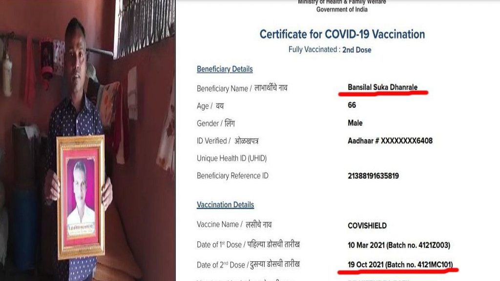 धुळे जिल्ह्यातील सिंदखेडा तालुक्यातील मालपूर गावात हा धक्कादायक प्रकार समोर आला आहे. बन्सीलाल धराळे या मृत व्यक्तीच्या नावावर १९ ऑक्टोबरला कोरोना लसीचा दुसरा डोस घेतल्याचं प्रमाणपत्र जारी करण्यात आलं. महत्वाची गोष्ट म्हणजे गोष्ट म्हणजे ६ एप्रिल रोजी बन्सीलाल यांचा अकस्मात मृत्यू झाला होता. १० मार्चला बन्सीलाल यांनी पहिला डोस घेतला होता. परंतू त्यांच्या मृत्यूनंतरही लसीचा दुसरा डोसचं प्रमाणपत्र आल्यामुळे त्यांच्या परिवाराला धक्काच बसला.