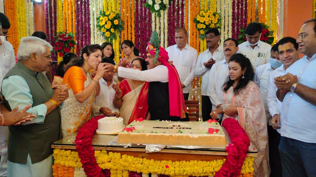 फोटो क्रमांक 2- दुसऱ्या फोटोत एखाद्या समारंभात (कदाचित जन्मदिन) दोघे एकत्र केक कापताना किंवा केक भरवताना दिसत आहेत. आसपास अनेक नेते आणि कार्यकर्ते उपस्थित आहेत.