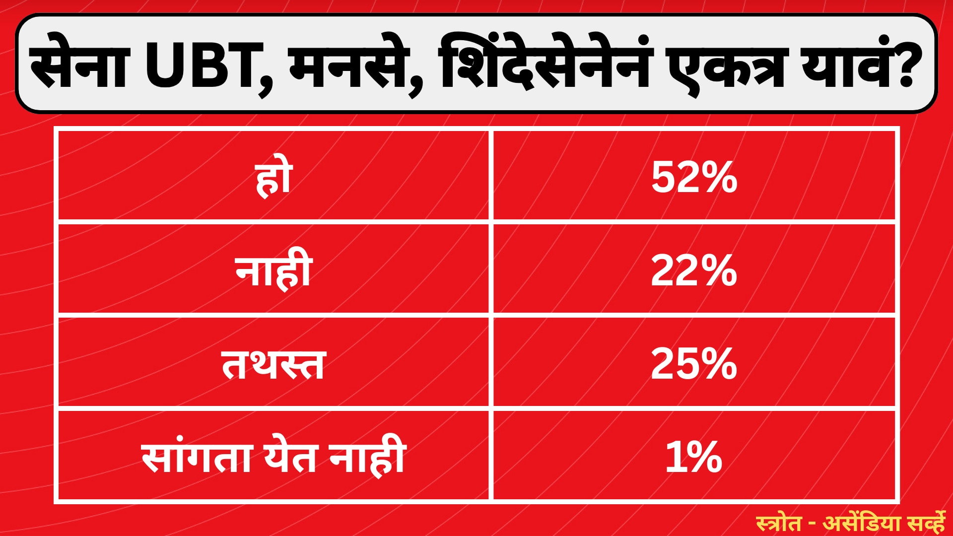 सर्व्हेतील मुख्य प्रश्न होता: "मूळ शिवसेनेतून तयार झालेले आजचे तीन पक्ष म्हणजे शिवसेना UBT, मनसे आणि शिवसेना शिंदे गट यांनी एकत्र यावे का?" यावर मुंबईकरांनी दिलेली उत्तरे अशी आहेत: