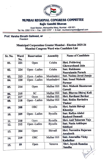 Mumbai Congress : महापालिका निवडणूक 2025-26 च्या पार्श्वभूमीवर आज दि: 29 डिसेंबर रोजी काँग्रेसने पहिली यादी जाहीर केली आहे. वंचित बहुजन आघाडीसोबत त्यांनी नुकतीच यातीची घोषणा केली. त्यानंतर त्यांनी एकूण 70 उमेदवारांची यादी जाहीर केली आहे. ठाकरे बंधु हे एकत्र आल्यानंतर काँग्रेसनं मुंबई महापालिका निवडणूक लढवण्यासाठी विरोध दर्शवला. याचाच फटका कुठेतरी ठाकरेंना बसण्याची संभावना काही राजकीय विश्लेषकांनी व्यक्त केली आहे. अशातच मुंबई महापालिका निवडणुकीत काँग्रेसनं पहिली यादी जाहीर केली आहे. ती यादी खालीलप्रमाणे नमूद केली आहे.