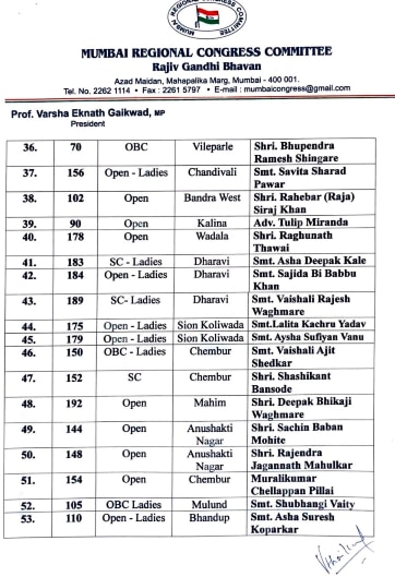काँग्रेसची मुंबई महापालिका निवडणुकीसाठी पहिली यादी जाहीर