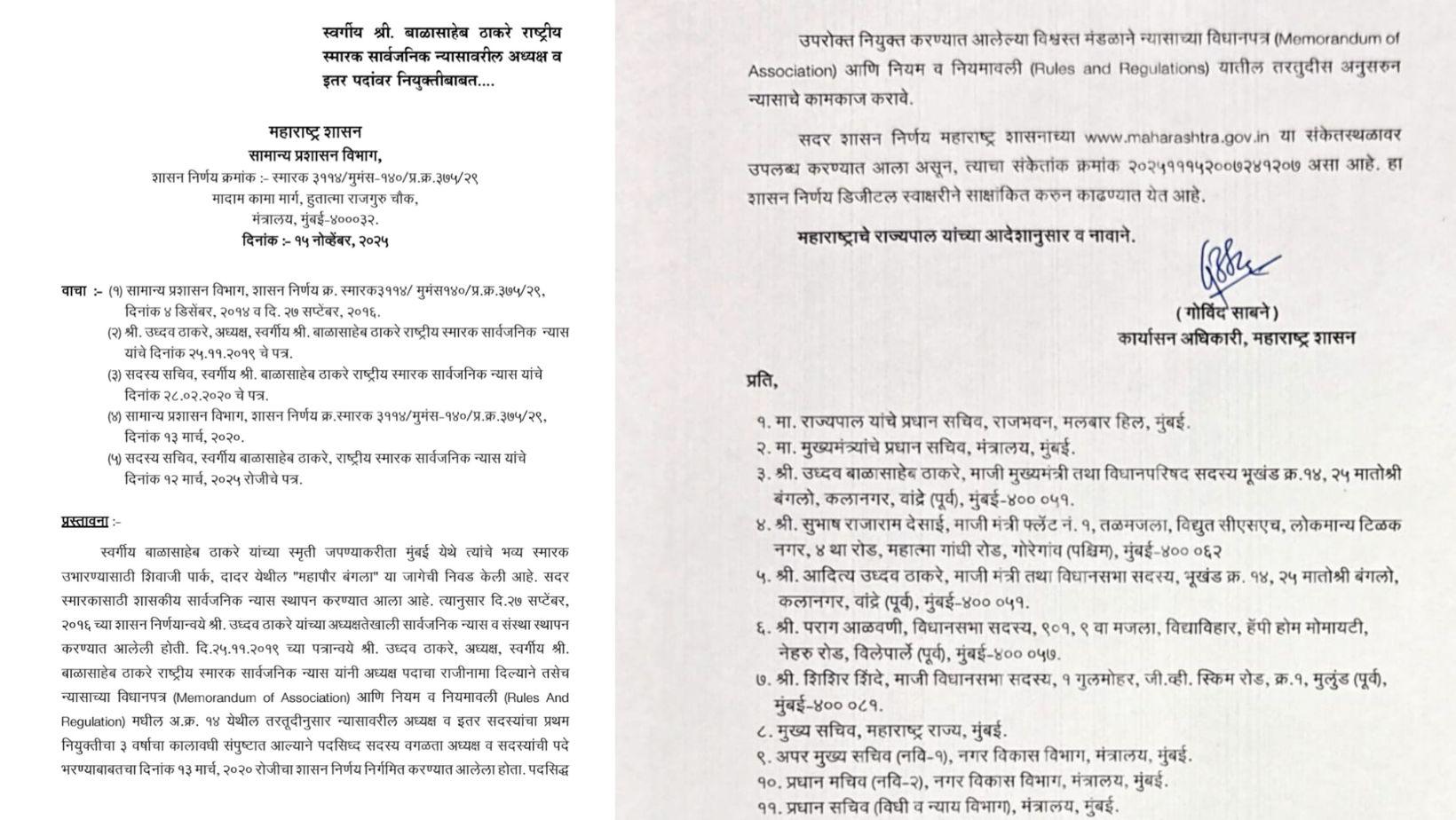 स्वर्गीय बाळासाहेब ठाकरे यांच्या स्मृती जपण्याकरीता मुंबई येथे व्यांचे भव्य स्मारक उभारण्यासाठी शिवाजी पार्क, दादर येथील 'महापौर बंगला" या जागेची निवड केली आहे. सदर स्मारकासाठी शासकीय सार्वजनिक न्यास स्थापन करण्यात आला आहे. त्यानुसार दि.२७ सप्टेंबर, २०१६ च्या शासन निर्णयान्वये श्री. उध्दव ठाकरे यांच्या अध्यक्षतेखाली सार्वजनिक न्यास व संस्था स्थापन करण्यात आलेली होती. दि.२५.११.२०१९ च्या पत्रान्वये श्री. उध्दव ठाकरे, अध्यक्ष, स्वर्गीय श्री. बाळासाहेब ठाकरे राष्ट्रीय स्मारक सार्वजनिक न्यास यांनी अध्यक्ष पदाचा राजीनामा दिल्याने तसेच न्यासाच्या विधानपत्र (Memorandum of Association) आणि नियम व नियमावली (Hules And Regulation) मधील अ.क्र. १४ येथील तरतूदीनुसार न्यासावरील अध्यक्ष व इतर सदस्यांचा प्रथम नियुक्तीचा ३ वर्षाचा कालावधी संपुष्टात आल्याने पदसिध्द सदस्य वगळता अध्यक्ष व सदस्यांची पदे भरण्याबाबतचा दिनांक १३ मार्च, २०२० रोजीचा शासन निर्णय निर्गमित करण्यात आलेला होता. पदसिद्ध सदस्य वगळता अध्यक्ष व इतर सदस्यांची न्यासावरील ५ वर्षाची मुदत दि. ११ मार्च, २०२५ रोजी संपल्याने सदर पदे भरण्याबाबतचा प्रस्ताव विचाराधीन होता.